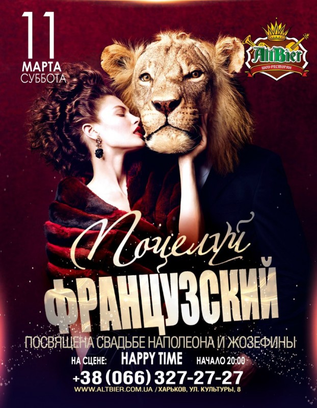 Свадьба занимает в нашей жизни весьма значительное место. Это не просто красивая церемония и веселый праздник, это таинство соединения двух любящих сердец, момент, в который рождается новая семья, счастливейшее мгновение, после которого нет разделения на «ты» и «я», а есть только одно целое «мы»! 220 лет назад состоялась свадьба пары имена которой запомнили во всем мире, Наполеон Бонапарт взял в жены Жозефину Богарне. Это именно тот праздник любви о котором писали выше. Шоу-ресторан AltBier это первый в городе ресторан, который умеет любить! И приглашает всех гостей на праздник, посвященный именно этому светлому чувству. Весь вечер на сцене группа HAPPY TIME.