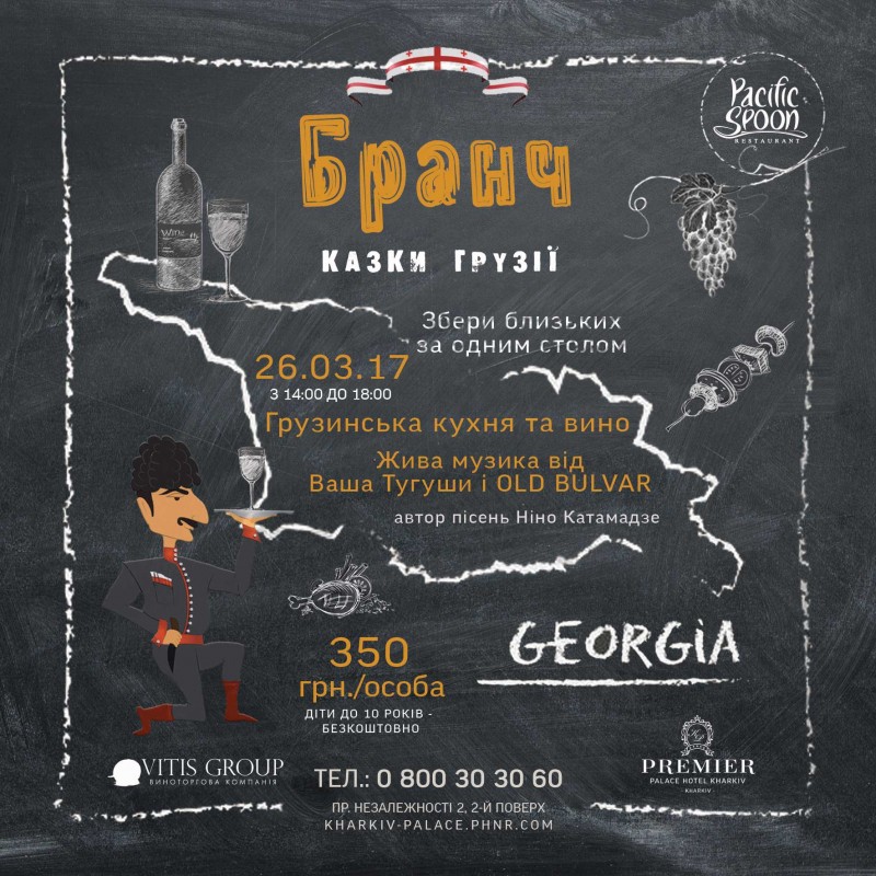 Вообще-то, бранч - это что-то сугубо английское. Но там, где есть желание и фантазия - нет места стереотипам. Вот мы и решили сделать грузинский бранч. Здесь никто не заскучает, ни господа и дамы, желающие новых гастрономических впечатлений, ни дети, любящие безудержное веселье. На бранче "Сказки Грузии" в Pacific Spoon Вас ждет настоящая грузинская кухня, вино и музыка, а главное - настоящее грузинское гостеприимство!
