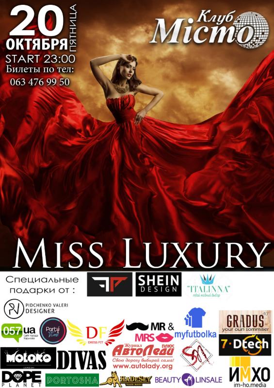 Хорошая музыка, отличное настроение, жаркие танцы, интересная шоу программа, красивые девушки и многое другое ждёт Вас на конкурсе красоты "Miss Luxury" в клубе Мисто! Не пропустите самую жаркую вечеринку этого октября! "Miss Luxury" новый сезон - скучать не придётся!