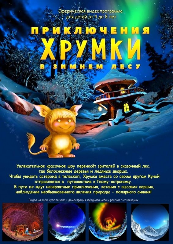 Увлекательное красочное шоу «Приключения Хрумки в зимнем лесу» знакомит самых маленьких посетителей планетария с созвездиями зимнего ночного неба, а также с необыкновенными явлениями, которые можно увидеть на небе - полярным сиянием и полетом астероида. Чтобы увидеть астероид в телескоп, Хрумка вместе со своим другом Куней отправляется в путешествие к Гному-астроному. В пути их ждут невероятные приключения.