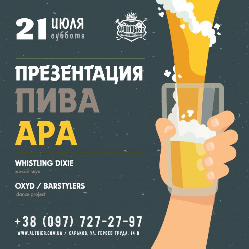 В эту субботу мы презентуем гостям ресторана летний сорт пива - American Pale Ale, который впервые получил свою популярность в 1970-м году, в Америке.Этот напиток получился достаточно летним м легких, несмотря на свою умеренную горечь, по-этому презентация будет посвящена винтажной Америке и ее пляжному отдыху. Каждый из гостей попробует этот напиток как угощение от ресторана и сможет насладиться шоу, танцами и музыкой. Самый активный стол, который выпьет больше всего пенного напитка, выиграет целую бочку пива от Altbier. На сцене в этот вечер группа Whistling Dixie, шоу балет Oxyd и Barstylers. Заказать стол можно на нашем сайте.