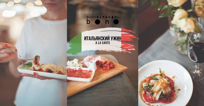 Каждую пятницу в 18:00 мы проводим итальянский ужин «A La Carte» в Bono! Начинаем с аперитива. Далее вас закружит в танце череда закусок: сырный дуэт горгондзоллы и маскарпоне на тостах, сет мясных деликатесов из сальсичча пикканте, карне салада и мортаделла болонья с фисташками. После подаем: романьольские тортеллини, пармиджана из баклажанов, салат из помидоров и пекорино и сальтимбокка а-ля романа. Завершаем ужин неповторимым ягодным сорбетом, гриссини и тостами. Попробовать можно все и по нескольку раз! Bellissimo! Стоимость вечера – 450 грн. Спешите забронировать столик на нашей уютной веранде!