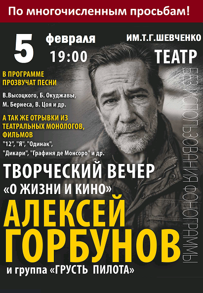 5 февраля в театре Шевченко, по многочисленным просьбам, пройдет удивительный и очень интересный Творческий вечер Алексея Горбунова.