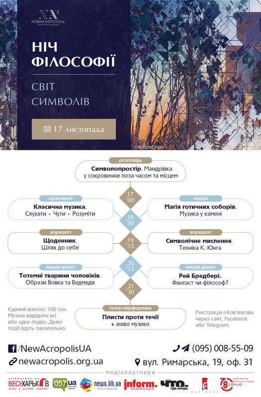 Ночь философии — это путешествие в мирсимволов и вглубь своей души, диалоги оприроде вещей и путь познания себя какчеловека. Приглашаем отметить Всемирный день философии с«Новым Акрополем»! Театр-перформанс, воркшопы, лекции-беседы и кофе-брейки — вместе мысоздадим пространство для размышлений ипогружение в свой внутренний мир и в мируниверсальных символов. Некоторые события будут проходитьпараллельно в двух залах, поэтому выберитето, что вам наиболее интересно.