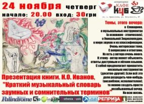 Темы, которые можно затронуть в этот вечер: О Словарике, о музыкальных инструментах (в основном - этнических, но и о любых других), об Уникальной Энциклопедии (дождётся ли выхода в свет?), о мире звуков и их классификации. Очень интересная тема.