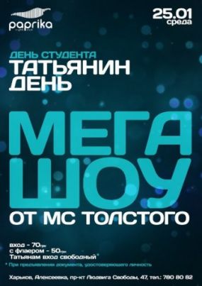 Отпраздновать День Студента в «большой» и дружной компании, вместе с самым добрым и позитивным человеком, обладающим потрясающей харизмой, и искромётным чувством юмора! Мс Толстый.