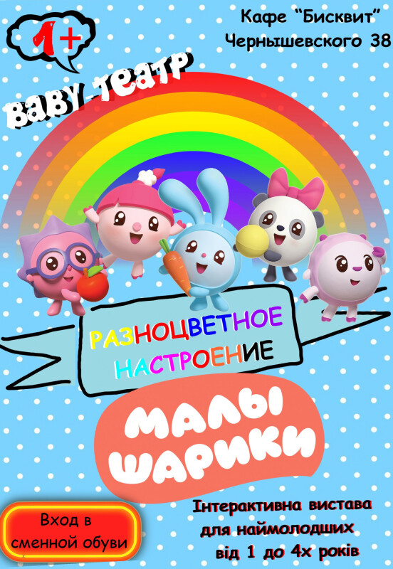 Уже полюбившийся всем малышам на новогодние праздники «Бэби-театр» возвращается с новой интерактивной программой «Разноцветное настроение», теперь в новом специально подготовленном зале по адресу: метро Университет, ул. Чернышевского 38 (кафе «Бисквит», ориентир: возле школы № 5, пересечение улиц Чернышевского и Свободы (бывшая Иванова))