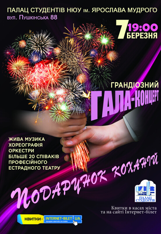 Гала-концерт «Подарок любимой» - это удивительный праздник от солистов и творческих коллективов профессионального эстрадного театра Дворца студентов НЮУ имени Ярослава Мудрого.