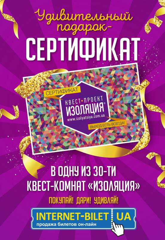 Стоимость приобретения сертификата в квест комнаты "ИЗОЛЯЦИЯ" 600 грн. Сертификат действителен до конца 2019 года!