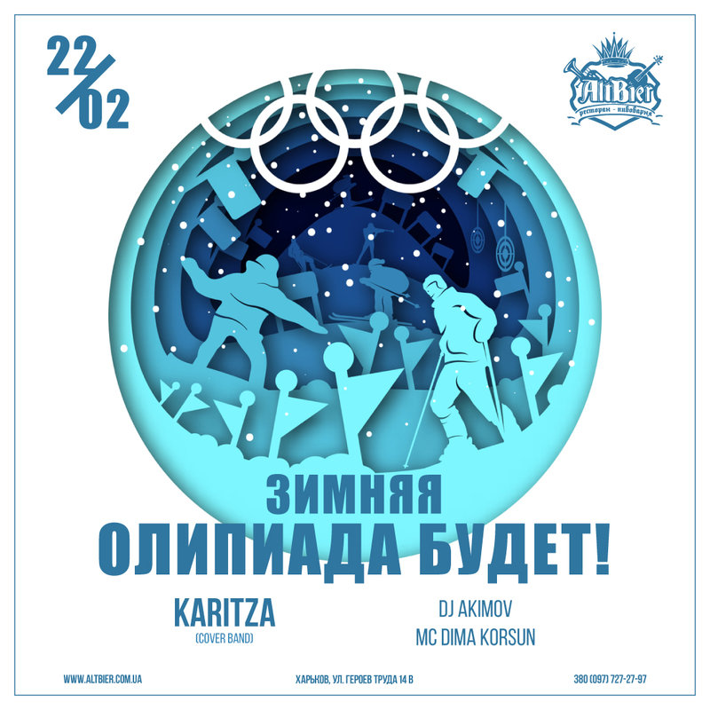 Да-да, мы знаем, что в этом году Олимпиады не будет, но мы решили провести свои зимние соревнования среди любителей спортивного попивания пива. Ресторан-пивоварня Altbier, на один вечер превратится в спортивную деревню со своими туристами, звездами и спортивно-пивными площадками. На открытии Олимпиады выступит cover band KARITZA, а ведущий Дима Корсун.