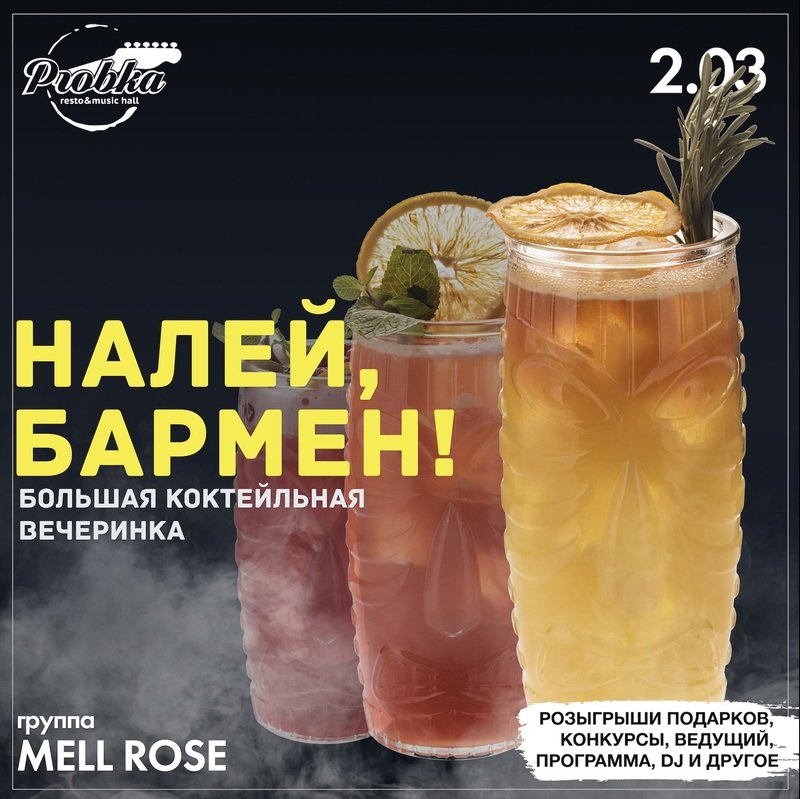 Наслаждаться вкуснейшими шедеврами наших барменов мы будем под музыку группы MELL ROSE. Весь вечер будет полон сюрпризов и неожиданностей