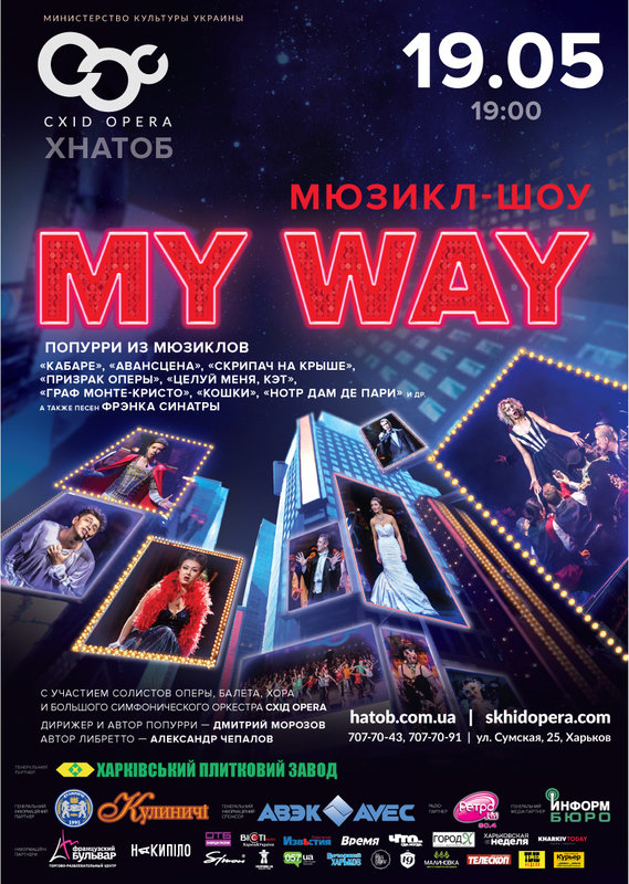 Музыкальное представление попурри из мюзиклов "Кабаре", "Авансцена", "Скрипач на крыше", "Призрак оперы", "Целуй меня, Кэт", "Граф Монте-Кристо", "Кошки", "Нотр Дам де Пари" и др., а также песни Френка Синатры