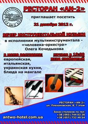 Так хочется в зимний вечер посидеть в уютном заведении, отведать изысканные блюда и послушать приятную расслабляющую музыку. Именно такой сказочный вечер ждет Вас в ресторане «AN-2»!