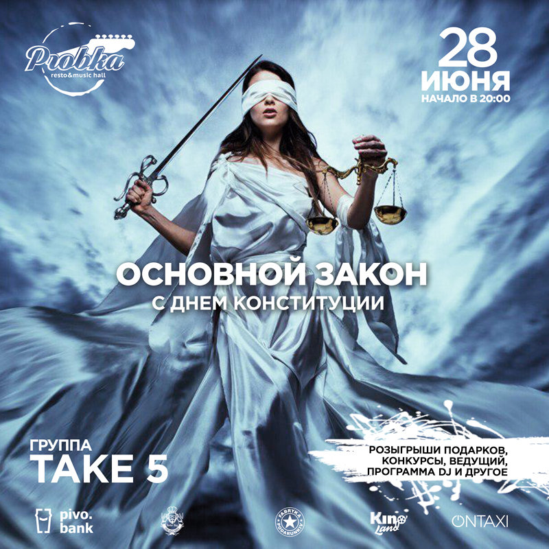 С Днем Конституции, страна! Наш основной закон в эту пятницу - подарить вам драйвовую вечеринку, музыкальное настроение и подбодрить выйти на танцпол. На сцене талантливая и крутая группа TAKE FIVE. Парни готовят потрясающую музыкальную программу, которая не позволить никому сидеть на месте