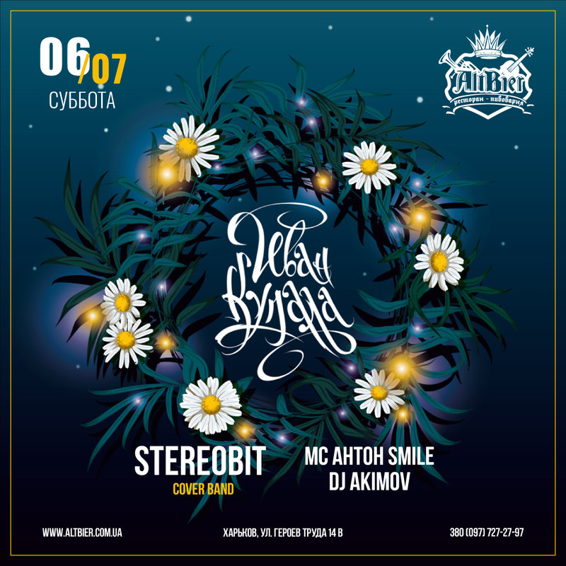В ночь с 6 на 7 июля в ресторане-пивоварне Altbier будут отмечать старинный славянский праздник Ивана Купала. Ивент обещает незабываемые магические выходные, окутанные волшебными преданиями, удивительными обрядами и другими изюминками народных гуляний. В программе мероприятия мастер-классы, концерт с участием группы Stereobit, диджея Akimova и Mc Антон Smile.