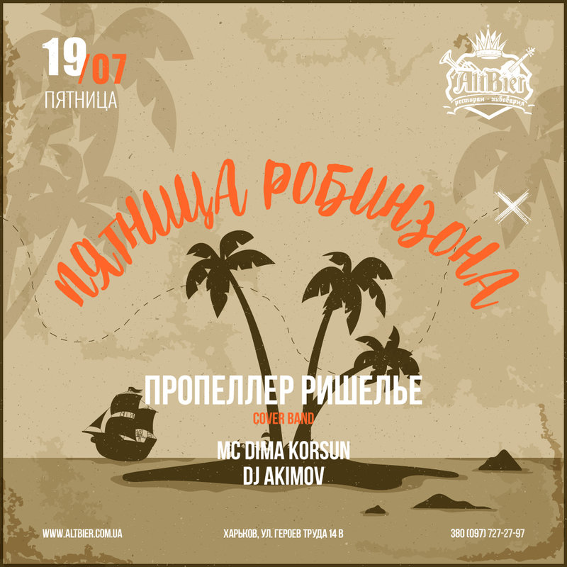 Это не просто пятница, это Пятница Робинзона, который попал на необитаемый остров ресторана-пивоварни Altbier и теперь ему предстоит испытание. Вместе будем учиться выживать в нелегких условиях пивоварения и экзотического климата. На сцене в этот вечер выступит cover band Пропеллер Ришелье, ведущий Дима Корсун при поддержке аниматоров Trush Corporation. За ночное настроение отвечают бармены спец-назначения и Dj Akimov.