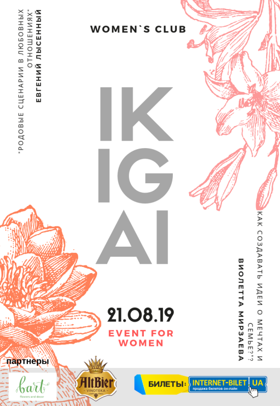 “IKIGAI” Event for women – это не только образовательные мероприятие для девушек, это полноценный «клуб по- интересам». Главные цели — общение и развитие, поиск единомышленниц, обмен опытом, знаниями. Также мы приглашаем экспертов - успешных, красивых, счастливых женщин, которые могут передать свой опыт нашим участницам.