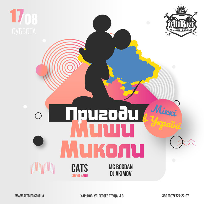 В эту субботу с визитом в Украину приедет Микки Маус, а ресторан-пивоварня Altbier будет встречать его с хлебом и солью. На сцене с хитами гурт Кiшки, они же cover band CATS, ведущий Кот Леопольд, он же Mc Bogdan и Сipi Mишi, они же Trush Corporation.
