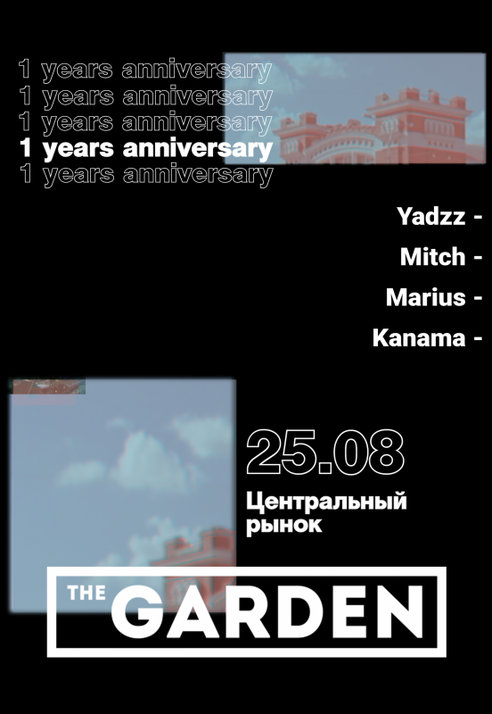 Прошёл целый год с момента создания ивента The Garden. За это время ему удалось стать знаковым событием для города, потому, пора отметить наш первый День рождения! В этот раз мы решили взять уникальную локацию и осуществить исторический ивент в самом необычном месте под названием Центральный рынок, куда перенесём нашу музыку, сад и самое ценное - каждого из вас! Вместе создадим ту самую атмосферу за которую вы нас и полюбили!