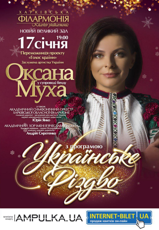 В Западной Украине уже стало доброй традицией - колядовать с Оксаной Мухой. Несколько лет подряд в январе певица приглашает на свои Рождественские концерты. И нынешняя зима - не исключение. Впервые Оксана Муха привезет «Украинское Рождество» в Харьков. В новом большом зале Харьковской филармонии обладательница титула «Голос страны», заслуженная артистка Украины выступит 17 января 2020 - в сопровождении группы музыкантов, а также академического симфонического оркестра Харьковской областной филармонии и академического хора имени Вячеслава Палкина. Начало концерта - в 19:00.
