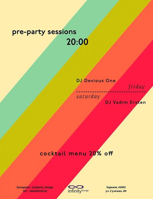 С нами отличная музыка, хорошее настроение и скидка на меню коктейлей 20%!