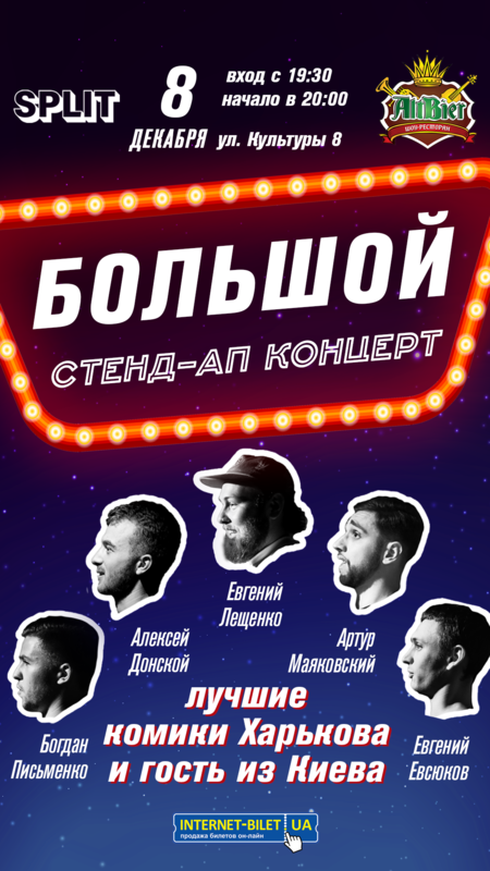 Да,так всё и будет!8 декабря на прекрасной сцене Шоу ресторана Altbier,стендап клуб “SPLIT Comedy” прогремит Большим стендап концертом!Уже весь город знает,что значит наш большой концерт-это значит что ваши щёки будут болеть, вам будет трудно дышать ,вы даже забудете про крылышки (!) вот как смешно Вам будет!Все ,о чем Вам нужно думать ,это скорость покупки билетов,поскольку они разлетаются как голуби на свадьбе!