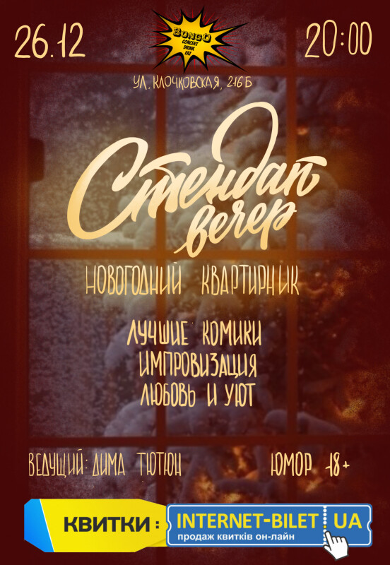 Новогодний квартирник от "Стендап вечер" - это 80 минут крутой и праздничной атмосферы, лучший материал за уходящий год от лучших комиков Харькова, а также неповторимая импровизация. Говорят: "Как Новый год встретишь, так его и проведешь", мы тебе предлагаем это сделать с позитивными эмоциями. Смелый юмор без табу и ограничений и настоящая энергия живого стендап-выступления - вот ради чего стоит придти 26 декабря в Bongo Event Bar.