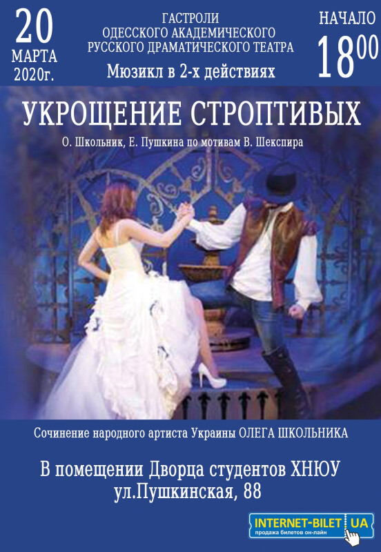 Знаменитая история предстает в современном праздничном обличье: искрометный юмор, невероятные декорации, стильные костюмы! Звон венчальных колокольцев и знаменитые итальянские напевы сопровождают великолепную любовную схватку Катарины и Петруччо.. Наш спектакль пропустить нельзя: вместе с артистами Вы захотите танцевать, петь,