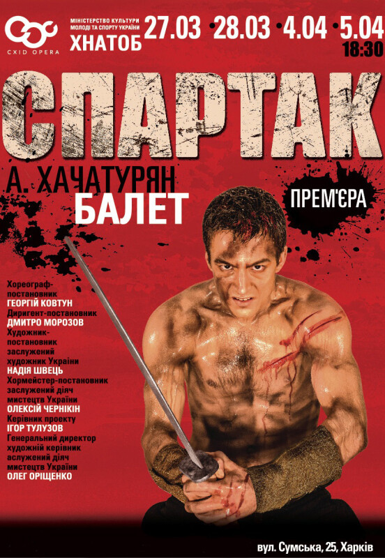 Балет «Спартак» Арама Хачатуряна украинский балетмейстер Георгий Ковтун поставил в Михайловском театре (бывший МАЛЕГОТ в Ленинграде-Петербурге) еще в 2008 году. Этот спектакль и сегодня востребован, многим отличаясь от уже классических трактовок Леонида Якобсона, Игоря Моисеева, Юрия Григоровича. В Харькове «Спартак» дважды (1967, 1979) ставил киевлянин Анатолий Шекера, а на премьере присутствовал знаменитый автор музыки (он даже дирижировал первым действием). Конечно, в те времена свободолюбивые идеи романа Рафаэлло Джованьоли «Спартак» и его балетное воплощение были связаны с утопическими планами советского строя сделать весь мир свободным от рабства и угнетения. Но общечеловеческая сущность трагедии Спартака и его товарищей на фоне разлагающейся Римской империи была гораздо очевидней и эмоционально убедительней. Представитель новой генерации балетмейстеров, бунтарь и фантазер, а по профессии также каскадер, Георгий Ковтун, был вдохновлен прежде всего буйными ритмами и терпким гармониям армянского композитора. В результате он создал динамичные, покоряющие темпераментом сцены оргий и битв, любовных сцен и дуэтов раздора, чтобы показать новые, современные смыслы картин из прошлого. Он ставит массовые сцены так, что толпа становится выразителем единого порыва, и в то же время успевает дать индивидуальные характеристики каждому из артистов. Впервые мы услышим обновленную балетную партитуру, где зазвучит и начнет двигаться на сцене мощный двигатель действия хор – на сцене одновременно будут находиться около 200 человек. Даже звуки битвы – лязг мечей, воинственные выкрики и горячее дыхание толпы будут в спектакле приравнены к элементам сценической партитуры. Необыкновенно выразительны у Г. Ковтуна и любовные сцены, виртуозны почти акробатические поддержки, которые вызывают несмолкаемые аплодисменты зрительного зала. Балетмейстер сочинил и новое либретто, в котором не просто изменил имена многих персонажей, но по другому интерпретировал образы, поступки и чаяния героев.