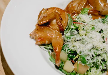 - Салат с перепелкой, кармелизированой грушей с бальзамическим гелем