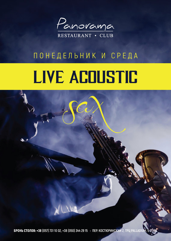 Приглашаем Вас на акустические вечера в Panorama Restaurant. Забудьте о тяжелых рабочих буднях и расслабьтесь в уютной атмосфере, наслаждаясь любимыми блюдами под аккомпанемент саксофона