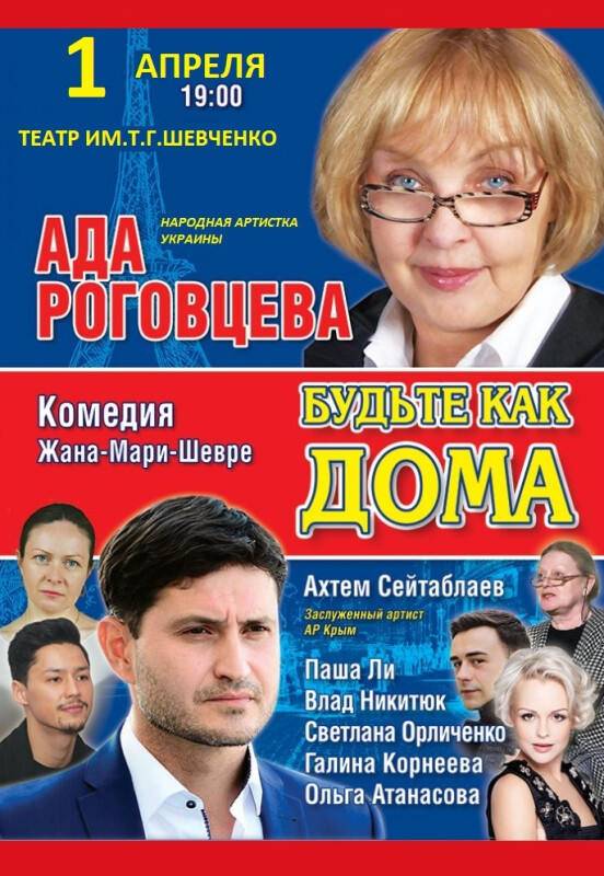 В спектакле «Будьте, как дома» также заняты ведущие актеры киевских театров: Галина Корнеева, Заслуженная артистка Украины Светлана Орличенко, Ольга Атанасова, Владислав Никитюк, Павел Ли.