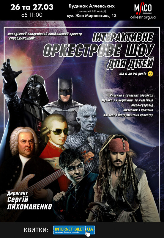 В четверг и в пятницу 26 и 27 марта Молодежный академический симфонический оркестр «Слобожанский» представляет оригинальную концертную программу - «ИНТЕРАКТИВНОЕ оркестровой ШОУ ДЛЯ ДЕТЕЙ» - лучшее мероприятие для школьников и их родителей!