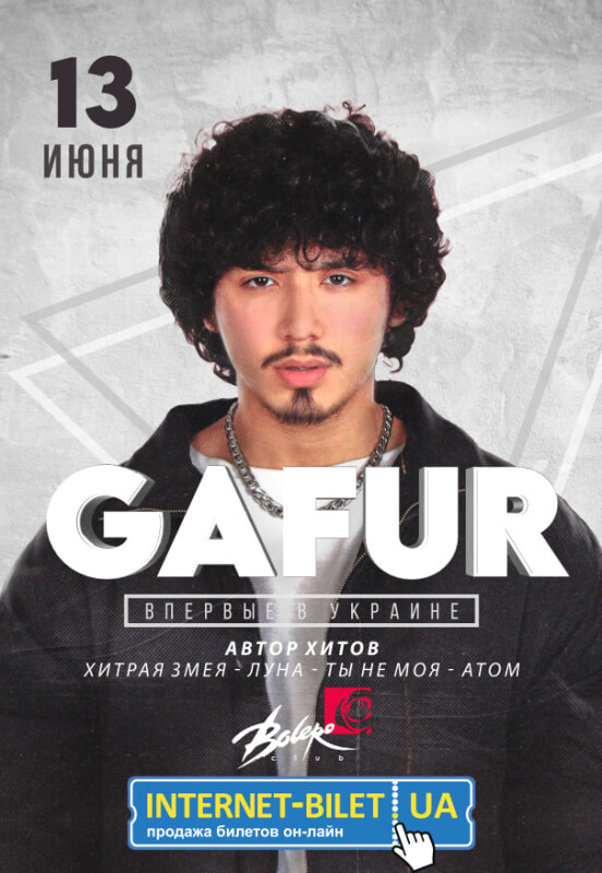 29 августа Впервые в Украине GAFUR - восходящая звезда самого популярного лейбла RAAVA Music таких исполнителей как Jony, Elman, Andro. И автор хитов: «Луна», «Ты не мой», «Хитрая змея», «Атом». Не пропусти! Впервые в Украине! Mc Nabokov Dj Space & Bolero Show Girls