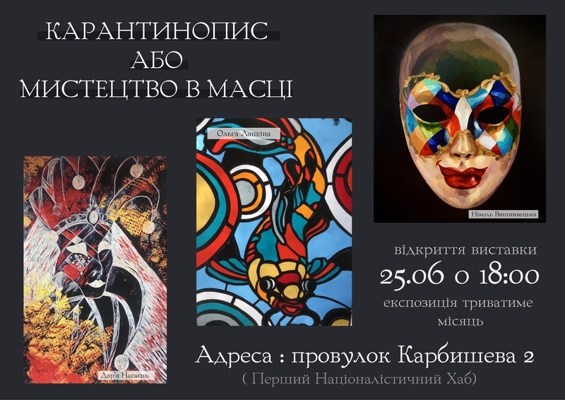 С 25 июня по 24 июля 2020 в рамках художественной галереи «Дюрер» в Первом националистической хабе будет экспонироваться коллективная выставка живописи, графики и скульптуры «Карантинопис или Искусство в маске». На выставке будут представлены работы молодых художниц: