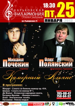 От классических сонат Моцарта и Р. Шумана, романтических виртуозных пассажей программных пьес М. де Фальи, Е. Изаи и М. Паганини и к современному произведению львовянки Богданы Фроляк «Венера в мехах» - вот программа концертного выступления звездного дуэта Михаила Почекина и Олега Полянского.