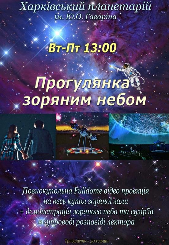 Познавательная полнокупольная видео программа расскажет Вам о тайнах космоса. А с помощью аппарата Планетарий Вам максимально реалистично продемонстрируют звёзды и созвездия, передавая практически точную копию звёздного неба. Лектор расскажет о том, что интересного можно увидеть на небе своими глазами. При этом на куполе будет видно несколько тысяч звёзд.