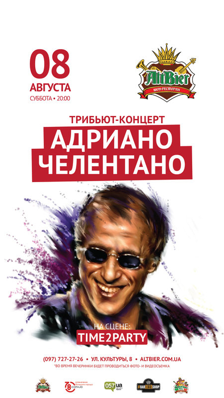 Уже 8 августа, Вы сможете услышать хиты любимого певца «живьем» в исполнении группы TIME2PARTY. В программу войдут полюбившиеся всеми песни Адриано Челентано