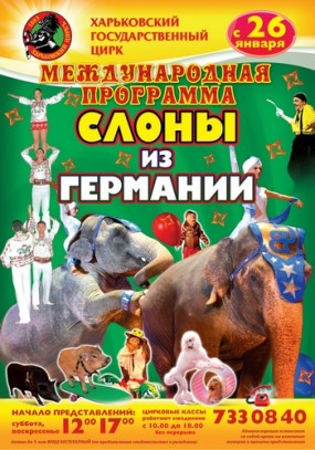 Программа с участиематтракциона со слонами - братьев Гарднэр (Германия), дрессированные вьетнамские свинки, номер с обезьянами и собаками, а также акробаты, гимнасты, эквилибристы и конечно же весёлые клоуны.
