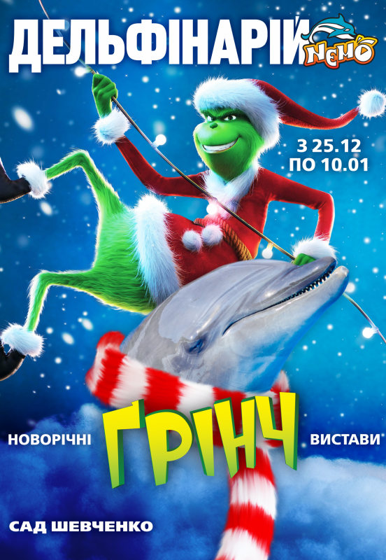 С 25 декабря по 10 января Вас ждут новогодние приключения Гринча,белых китов, дельфинов, морских котиков, красавицы Снегурочки и Деда Мороза! Чудесные перевоплощения, сказочные приключения, магия и отличное настроение - все это ждет Вас на наших новогодних представлениях. Будет интересно всем: и детям, и взрослым.