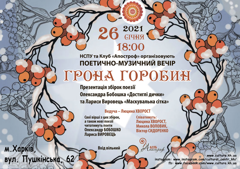 26 января 2021 в 18:00 в Областном организационно-методическом центре культуры и искусства состоится поэтически-музыкальный вечер «Гроздья рябин».