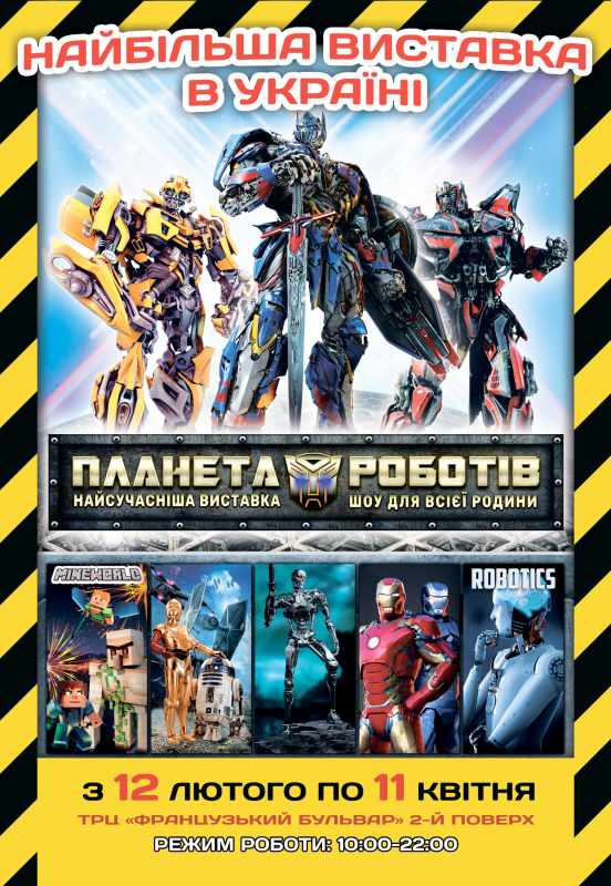 "Планета Роботов" - это уникальная интерактивная выставка современных роботов и трансформеров из металла, в полную величину, эта выставка считается крупнейшая в Украине!