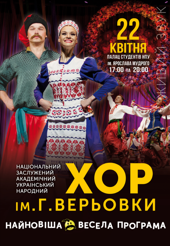 Билеты на концерт этого поистине универсального художественного коллектива, своим совершенным искусством репрезентирующего все самое ценное и лучшее из неисчерпаемого родника народного творчества Украины, никогда долго не залёживаются. Гости Дворца студентов НЮУ им. Ярослава Мудрого которые купят билеты на выступление Украинского народного хора, услышат и увидят множество довольно разножанровых композиций - исторические думы, чумацкие и казацкие песни с танцами, хоровые шуточные сценки, обрядовую и семейно-бытовую лирику – песни и танцы, которые исполняются на свадьбах, праздниках урожая, во время колядок, а также оригинальные песни современных композиторов. Во многих уникальных композициях коллектива музыка, танец и пение выступают органичным триединством. Если вы никогда не бывали на концерте хора, вам обязательно следует познакомиться с едва ли не ярчайшим представителем и хранителем украинской песенной культуры.
