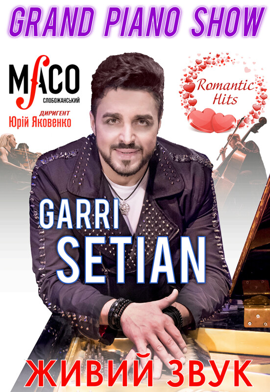 Солист – Заслуженный артист Украины Гарри Сетьян, пианист и певец, представитель музыкального стиля «Classical Crossover», сочетающий классику с современными эстрадными течениями, с новой концертной программой «Grand Piano Show» в сопровождении симфонического оркестра МАСО «Слобожанский». За дирижерским пультом Заслуженный деятель искусств Украины Юрий Яковенко.