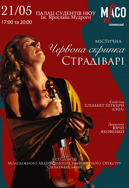 Элизабет Питкерн - владелица «Красного Мендельсона» и замечательная скрипачка. Она гастролирует по миру и щедро дарит людям уникальное звучание своего инструмента, полученного в подарок от любимого дедушки 30 лет назад. Ее приглашают самые известные площадки планеты, среди которых Карнеги-Холл, Линкольн-Центр и другие. А в мае Элизабет и её таинственную скрипку можно будет снова услышать в Харькове. Аккомпанирует ей единственный в Украине Молодежный академический симфонический оркестр «СЛОБОЖАНСКИЙй». Под руководством дирижера Юрия ЯКОВЕНКО оркестр создаст волшебный мостик между зрителями и загадочным миром одного из величайших шедевров Антонио Страдивари.
