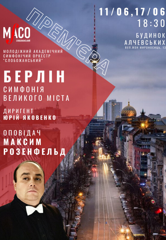 11 и 17 июня МАСО "Слобожанский" и Максим РОЗЕНФЕЛЬД приглашают ценителей путешествий и замечательной музыки на ПРЕМЬЕРУ программы "Берлин. Симфония большого города". Это будет захватывающее "виртуальное" путешествие по Берлину, его истории и современности.