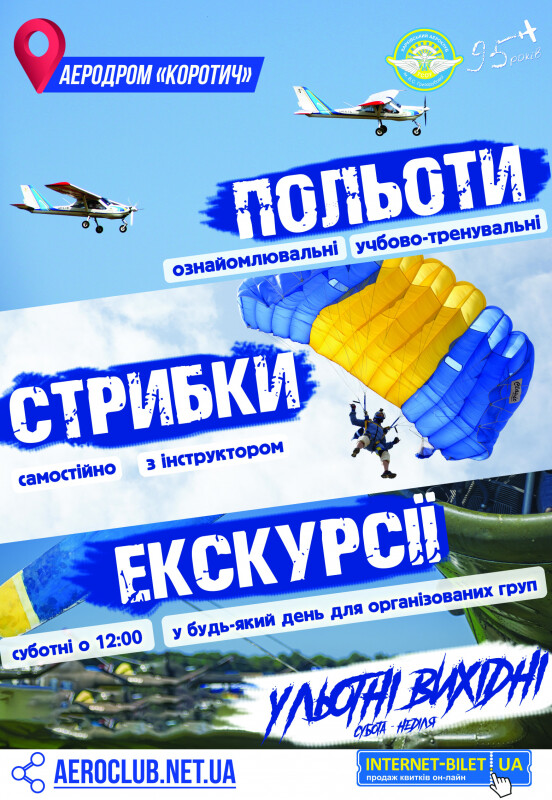 Хочешь нырнуть в небеса, почувствовать свободный полет, испытать волнение, адреналин, экстрим, и, в то же время, силу и уверенность? Все это возможно на аэродроме «Коротич», который специализируется на множестве направлений скайдайвинга: самостоятельно и с инструктором, с круглым куполом или «крылом », для новичков и для спортсменов.