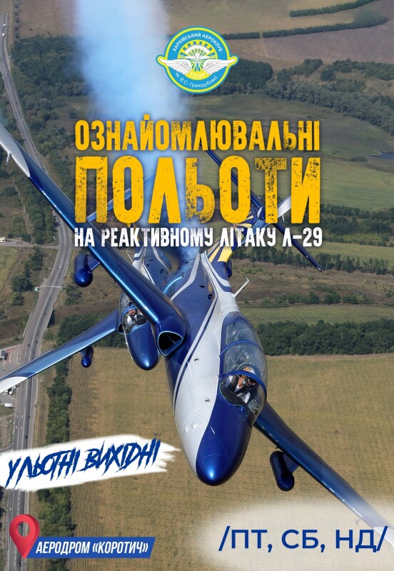 Полет на самолете Л-29 в кабине с летчиками пилотажной группы Харьковского аэроклуба – единственной в Украине действующей группы на реактивной технике – наверняка расширит список ваших незабываемых впечатлений и эмоций. На аэродроме «Коротич» вы можете выполнить ознакомительный полет в одиночку, а можете – вместе с друзьями в составе пары или тройки Л-29.