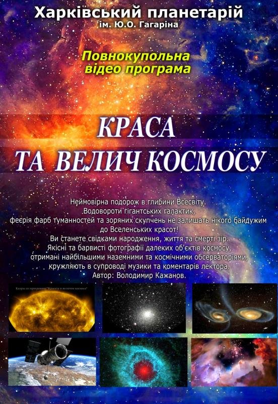 «Красота и величие космоса» - невероятное путешествие в глубины Вселенной. Водовороты гигантских галактик, феерия красок туманностей и звёздных скоплений не оставят никого равнодушным к Вселенским красотам Мира! Вы станете свидетелями рождения, жизни и смерти звёзд. Качественные и красочные фотографии далёких объектов Космоса, полученные крупнейшими наземными и космическими обсерваториями, кружатся в сопровождении космической музыки и комментариев лектора.