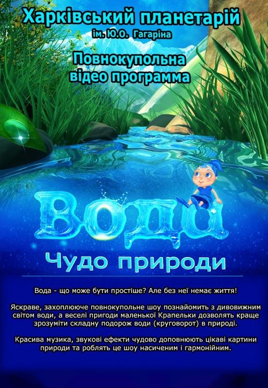 Яркое, захватывающее полнокупольное шоу познакомит с удивительным миром воды, а веселые приключения маленькой Капельки позволят лучше понять сложное путешествие воды (круговорот) в природе.